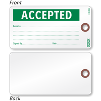 An accepted tag typically has the word ACCEPTED in bold text. It also includes write-on fields for an inspector's signature or initials, the date of acceptance, and a part or batch number for traceability. You can view our range of custom inspection tags for personalized fields.