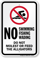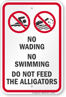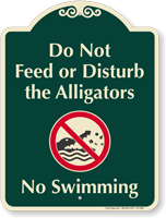 Common messages include "Danger - Alligators," "Do Not Feed Alligators"" and "No Swimming." "Do Not Feed" is critical because feeding causes gators to lose their fear of humans.