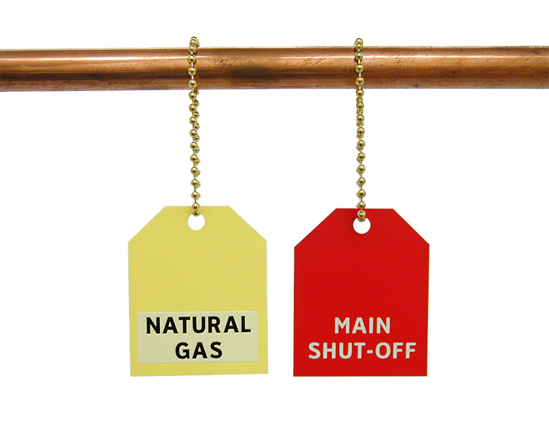 The tags have a large 3/8" or 1/2" hole at the top, allowing them to be easily attached to the valve handle or stem using a nylon tie-wrap, wire, or beaded chain. You can find all the necessary attachment supplies in our Tag Accessories section. We also carry aluminum valve tags for harsh environments.