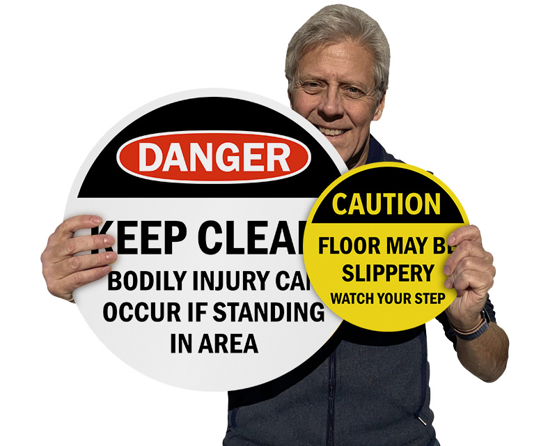 Custom floor signs are made from heavy-duty vinyl with a slip-resistant over-laminate and a high-bond adhesive that sticks to smooth concrete or tile.
