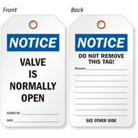Related tags include do not close valve, valve normally closed, and valve normally open to provide specific instructions about valve status.