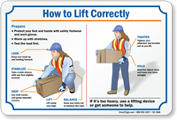 We carry lifting instruction signs that illustrate proper body mechanics for safe manual lifting - including bend your knees, keep the load close, and do not twist reminders. Signs are available in aluminum, plastic, and adhesive vinyl in multiple sizes for posting at loading docks, receiving areas, and any location where manual handling of heavy materials is a routine daily task.