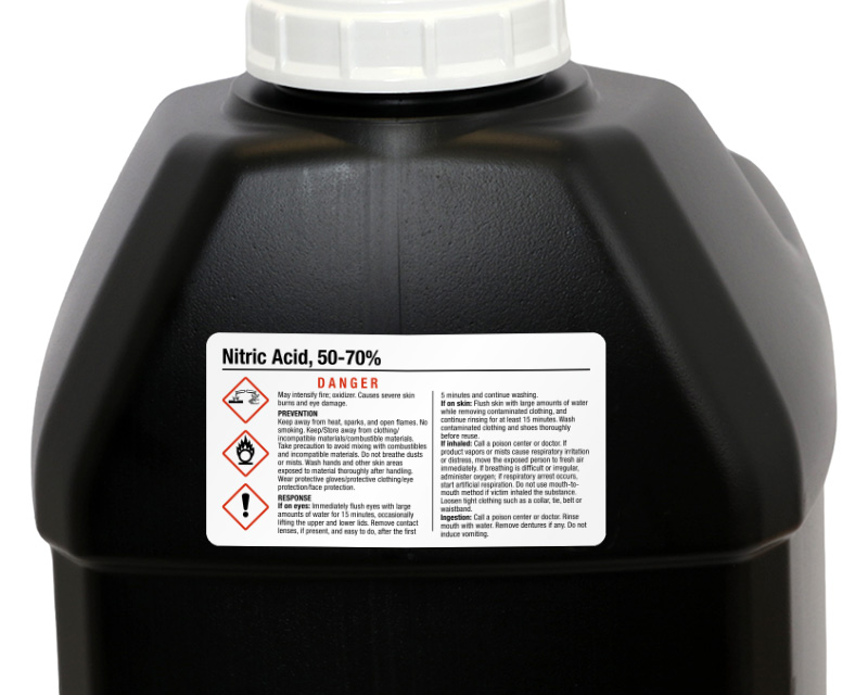 Keep everyone informed of the dangers, preventive care and immediate response to nitric acid with these effective Nitric Acid GHS labels. Specifically designed to provide all-encompassing information regarding the chemical properties and appropriate handling procedures. Ensure that employees and personnel have access to vital information regarding Nitric Acid in your facility, necessary for their safety and well-being.