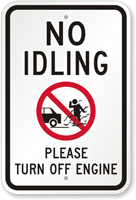 A no idling sign prohibits leaving a vehicle’s engine running while parked or stationary for extended periods, typically beyond 3–5 minutes. These signs help reduce air pollution and fuel waste, especially near schools, hospitals, and residential areas. Examples include the no idling for longer than 3 minute sign and idle free zone turn engine off sign.