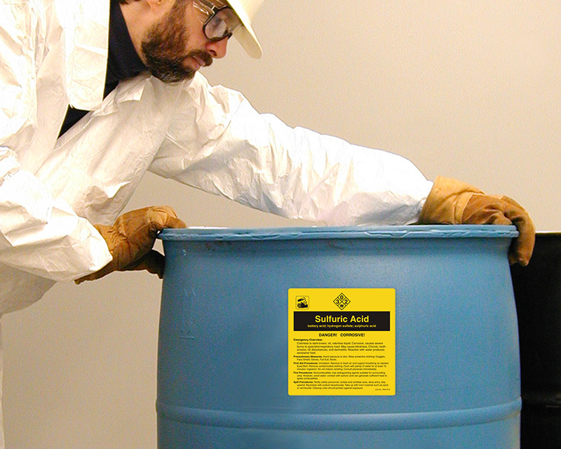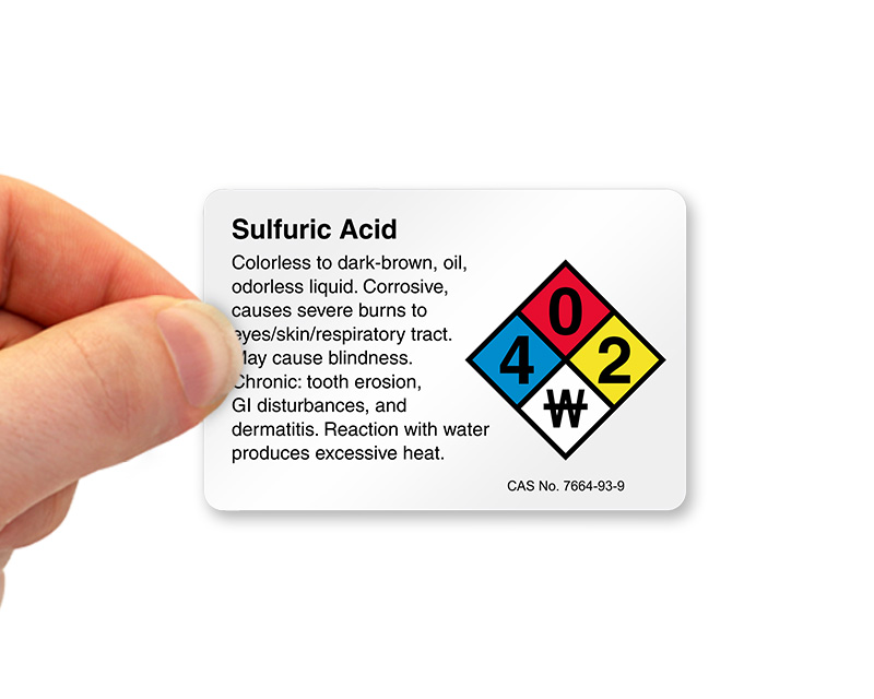 Handling and storing sulfuric acid requires strict safety protocols, personal protective equipment, and appropriate containment measures to minimize the risks associated with its use. Proper training and awareness are crucial for individuals working with or around sulfuric acid to prevent accidents and protect both human health and the environment. Sulfuric Acid Labels are designed to keep your workplace safe and compliant.