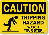 You should install "watch your step" signs at any location with an abrupt or unexpected change in elevation, especially those smaller than a full step. OSHA's regulations for walking-working surfaces require employers to protect against hazards, and this includes posting warnings for wet or slippery areas, uneven surfaces, and any elevation change (like a curb or single step) that could cause a trip.